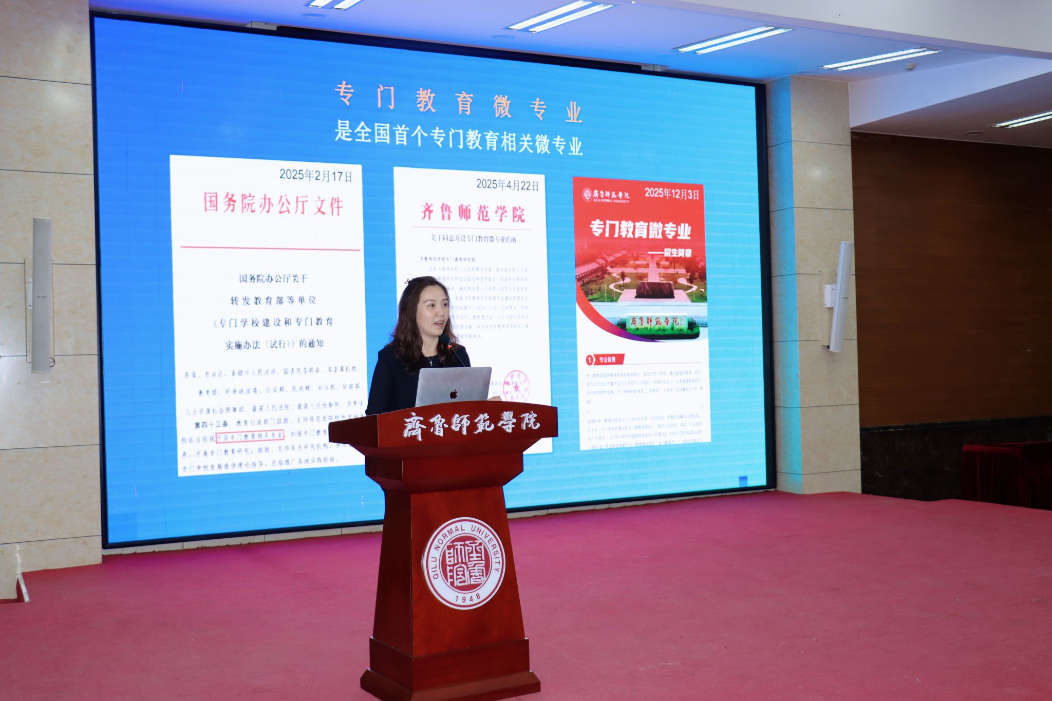 为深化专门教育领域人才培养,搭建高校与行业实践单位协同育人桥梁,4月2日,齐鲁师范学院“聚焦专门教育发展,搭建人才培养桥梁——专门教育微专业宣讲暨行业需求分享会”在学院第一学术报告厅顺利举行。齐鲁师范学院人事处处长、专门教育研究院副院长刘增军,学生工作处处长李玮,人事处副处长、专门教育研究院秘书长李华,研究院专业负责人刘桂荣教授出席,枣庄市正航学校校长高潮应邀出席。