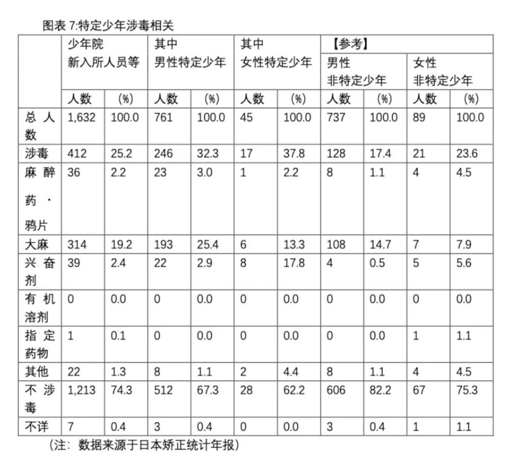 图表7展示了少年院新收容人员在实施违法行为时的药物使用情况。其中,男性特定少年所滥用的药物中,大麻占比最高;即便在非特定少年中,男女使用大麻的人员比例也处于较高水平。