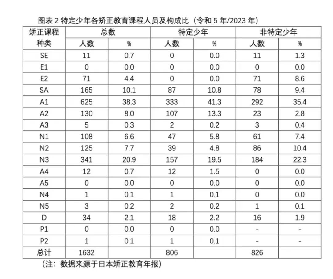 矫正教育课程可谓是教育的“课程体系”,是根据在院人员的年龄、身心障碍状况、犯罪倾向程度、在院人员适应社会生活所需能力及其他情况,对具备一定共同特征的在院人员所划定的类型。 就特定少年而言,其自身资质、成长环境等问题性与以往相比并无变化,因此,被裁定收容至第一种至第三种少年院的特定少年所适用的矫正教育课程,与依据《少年法》第24条第1款第3项规定被收容至少年院的人员所适用的课程一致。 图表2为2023年新增收容人员等按矫正教育课程划分的人数及构成比,分别对特定少年与非特定少年进行统计。在特定少年中,被编入“社会适应课程I(A1:完成义务教育人员中,在就业、就学、生活环境调整等社会适应方面存在问题,且不属于其他课程类型者)及社会适应课程II(A2:完成义务教育人员中,存在反社会价值观、行为倾向、自我控制力薄弱、认知偏差等需重点改善的个人资质问题者)”的人员比例,高于非特定少年,呈现出与法律修改前年长少年(18周岁以上)相同的趋势。
