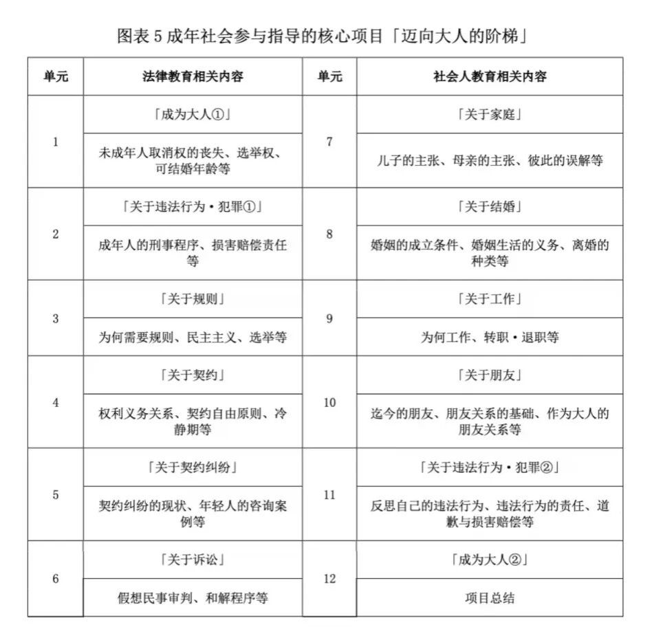 该指导的核心课程“迈向成年之路”以“法律教育”与“社会人教育”为两大支柱。