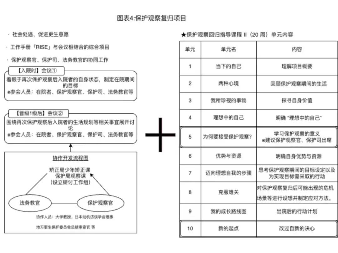 在教育课程方面,也以出院后接受保护观察为导向进行设计。为使第五种少年院在院人员能够在少年院与保护观察所的一贯方针下接受矫正教育,2021年度,日本保护局与矫正局联合成立工作组,如图表4所示,新开发了“保护观察复归程序”。
